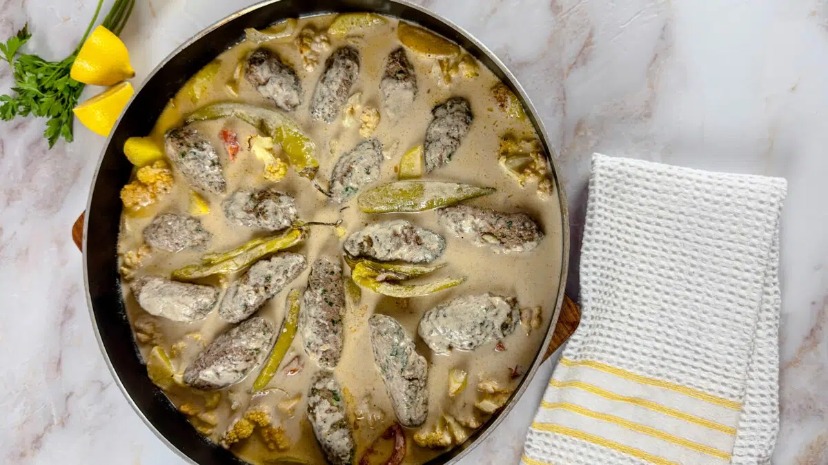 - في وعاء جانبي تخلط الطحينية مع الليمون و يوضع الخليط على النار حتى يتسبك و ممكن اضافة القليل من مرق اللحم