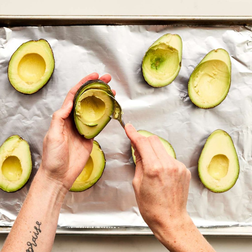 - اعصر عصير الليمون فوق الأفوكادو وتبّل بالملح ، ثم ضعها داخل صينية للخبز.