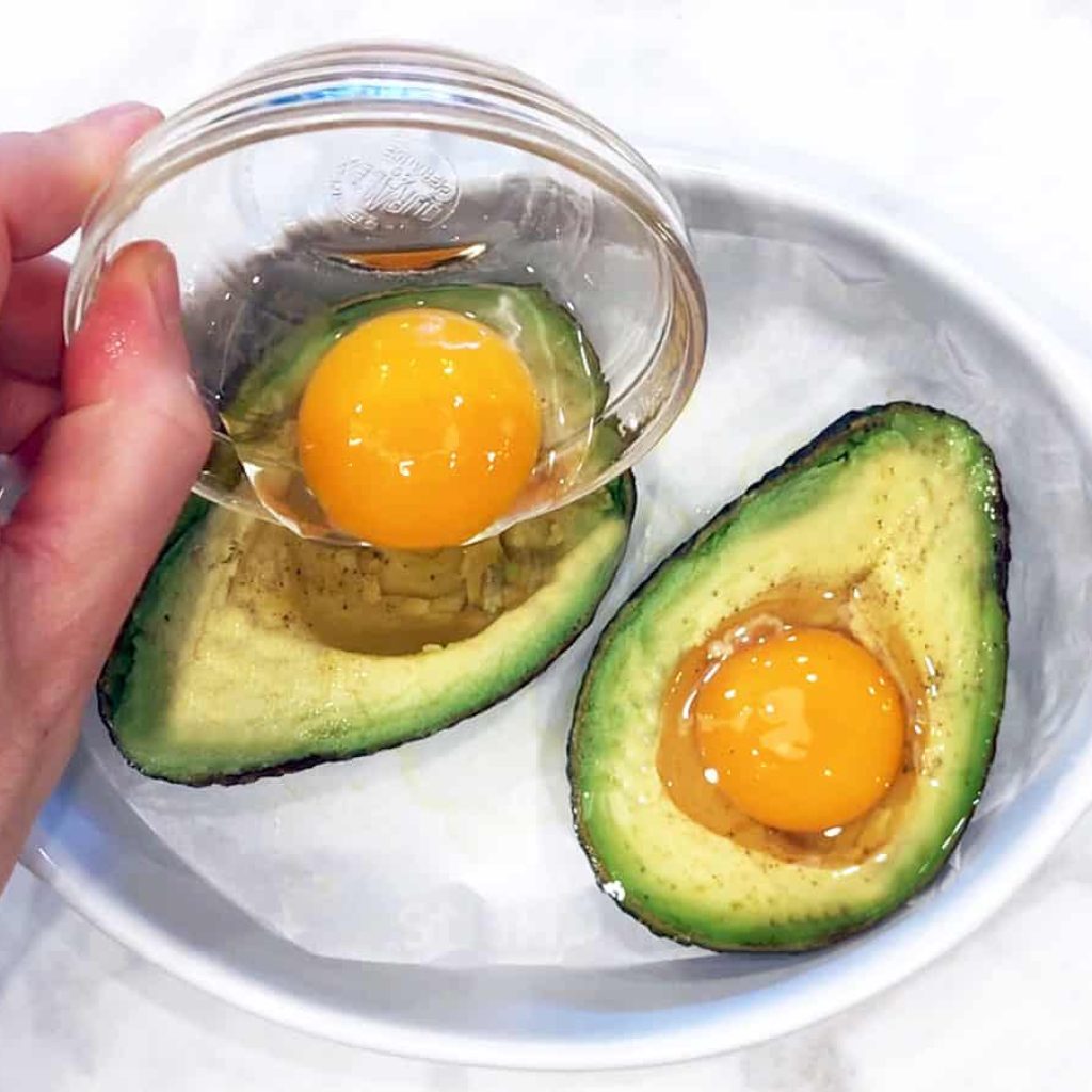 - ضع مصفاة صغيرة فوق وعاء صغير. اكسر بيضة واحدة في كل مرة في المصفاة واتركها حتى تجفّ الأجزاء المائية من بياض البيض. ثم اسكب البيضة المصفية بحرص في وسط حبة أفوكادو.